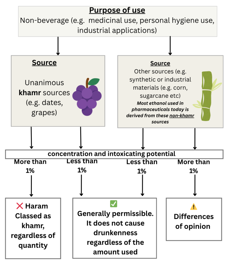 - ✅Non-beverage or medicinal use: Permissible according to the majority* of scholars if the ethanol is non-intoxicating and the medicine serves a genuine therapeutic purpose